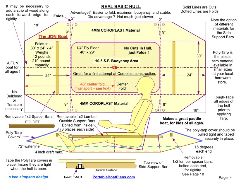There are 4 + different hull types defined on these plans. Each has it attributes, and shortcomings. All are for a single occupant, and all have a maximum capacity of about 220 pounds, including all gear. The intent of these designs is to provide a lightweight, easy to build small boat, that will fit in any vehicle for transport, and is inexpensive to construct, maintain and operate. Let's take a look at them.